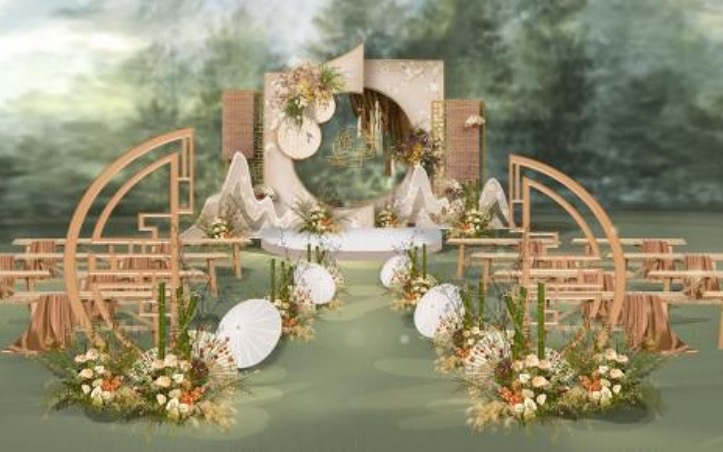 迎宾区域: 背景花艺装饰 整套道具装饰 桌子摆台一套 舞台区域: 提供5.5m宽*3m高舞台 (内) 整体行架打底一套 背景层次kt一套 背景装饰道具一套 背景铁艺一套 主背景花艺装饰 地面花艺装饰4组 T台区域: 花艺装饰6组 仪式区装饰道具一套 路引装饰道具一台 宾客椅30把 道具部分: 提供迎宾牌1个 提供手捧花1束 、胸花5朵 灯光舞美配置: 音响一套 注:花艺部分均为仿真花 椒黄路三区免车费